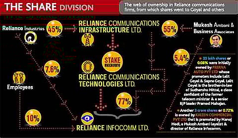 33 lakh shares or 0.08% were initially owned by Prerna Auto Pvt Ltd whose promoters include Lalit Goyal & Sapna Goyal. Lalit Goyal is the brother-in-lawof Sudhanshu Mittal, a close confidant of the former telecom minister & a senior BJP leader Pramod Mahajan.Another 3 crore shares or 0.72% is owned by Kaizen Commercial Pvt Ltd that is promoted by Manoj Modi, a Mukesh Ambani loyalist & director of Reliance Infocomm.