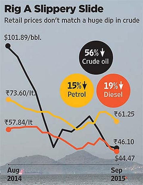 On May 26, 2014, the day Narendra Modi took the oath of office, the price of Indian crude was $108.56 per barrel. This month it hit $46.16 a barrel. A 57 per cent fall has prompted a question: why haven’t retail prices of fuel fallen in sync with crude’s downward spiral? After all, spiralling diesel and petrol costs were an election plank of the BJP? Surely, Indians don’t expect their fuel costs to dip 57 per cent, but the demanding (and financially stressed) urban resident is wondering why petrol is just 14 per cent less dear now than last May. Petrol cost roughly Rs 71 a litre last May; now it’s Rs 61.20. Diesel’s fall has been sharper, 20 per cent, now retailing at Rs 44.95.