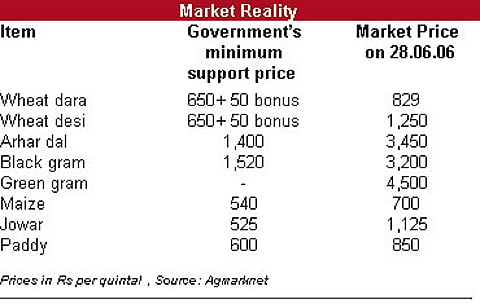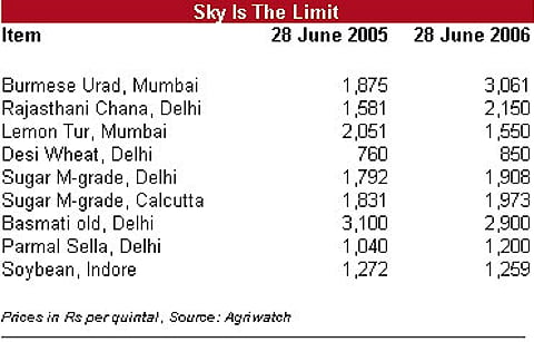 The second reason for the price rise logically follows from the short supply situation: speculative trading and hoarding. Praveen Khandelwal, secretary general of the Confederation of All India Traders (CAIT), says that low production coupled with high transportation costs due to the fuel price hike is the main reason for soaring prices. But he ignores the forward trading element in grains and pulses price rise. Explains Ramesh Chand, deputy director, NCAP, Pusa: "The price rise has to be seen from a broader perspectives of two new government policies, namely trading in commodity futures, and private buying from farmers at mandis. These big companies have the capacity to bear sufficient stocks and also enjoy considerable arbitrage opportunities." And with no stock limits, says Agriwatch, it is easy for these companies to show their muscle. To counter this, FCI officials had apparently sought government permission to intervene in the futures markets, which was not granted. But the government is now thinking of getting into futures trading in the next season.