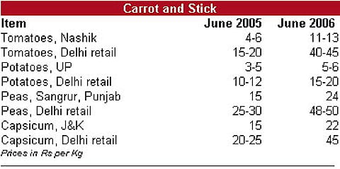 Many primary commodities and vegetables have seen a poor crop this year, mostly due to lack of sufficient price or other incentives for farmers and erratic weather. Says Jaswinder Singh Bhondli of Samrala, Punjab, who grows vegetables on 28 acres: "April and May were hotter than usual and the problem was aggravated by shortage of electricity. High temperatures hit the crop and about 40-50 per cent of the crop was lost. I have suffered financial losses upto 20 per cent, while smaller farmers have lost more." In Nashik, last year's glut that caused a few farmer suicides has led to lower cropping. Then late rains, excessive heat and a pest virus ruined the early crop. According to the Maharashtra State Agriculture Marketing Board, over one lakh quintals of tomatoes came to the apmcs last June. This year, arrivals are down to half. In UP, potato farmers are celebrating higher prices—retail rates have gone up to Rs 8-10. "This year we got an opportunity to sell outside UP because of poor crop in Punjab," says Brijendra Sonkar, president of the Vegetable and Fruit Merchant Association.