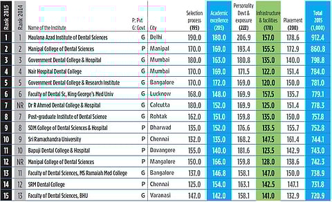 Top 20 Medical collegesTop 15 Dental colleges Only colleges that submitted complete objective data on time were ranked. Institutes which did not submit their data on time were not considered Govt-aided private institutions have been marked as private Only institutions offering MBBS/BDS courses (approved/affiliated) have been ranked NR: Not ranked