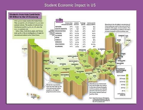 Even moving beyond traditional “commercial” sources of employment and economic gain, Asia’s weight for America is increasing. One of the largest US service-sector industries is education. About 700,000 foreign students are in the US of which more than 50 percent are from Asia, and the growth rate has been about 25 percent over the past decade. Apart from the hard-to-measure societal benefits of such exchanges, the Institute of International Education has estimated that students from Asia contribute about $9 billion to the US economy each year. Many students stay on to become entrepreneurs, creating new companies that provide employment. Silicon Valley, in particular, is known for the Asia-born, US-educated share of its entrepreneurs – but they are located throughout the country. As with employment from exports, the states which benefit from Asian students include California, Texas, New York and other large US states. But on the basis of Asia’s share of all international students, states like Nevada, South Dakota, Alabama, though their absolute numbers are smaller, still benefit. Nevada ranks first in the country with 78 percent of its 2,343 students from Asia and South Dakota ranks second with 75 percent of its 697 students from Asia.