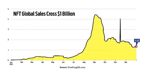 According to data from NonFungible.com, NFT transactions reached $754 million in the second quarter of 2021, a year-on-year increase of 3,453 per cent. Collectibles and artwork accounted for 80 per cent of all transactions. By December, this had crossed $1 billion.
