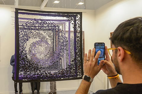Atul Dodiya gives pause to motion in his recreation of stills from the Federico Fellini classic ‘La Dolce Vita’. While Dodiya is a master of technique, the dialogues of the scene he paints act as the “springboard” for the point Dodiya tries to make: depicting the tension between a sense of wonderment and impending doom