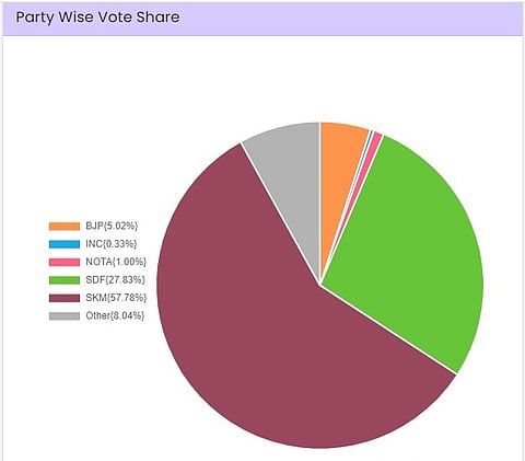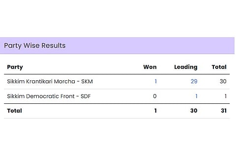 The Election Commission of India(ECI) data on Sunday showed the ruling SKM leading on 30 out of the state's 32 seats, while the opposition party SDF is leading on just one seat.