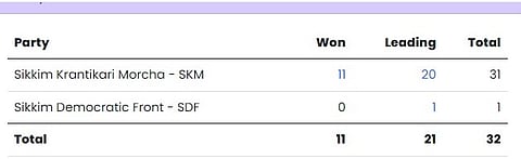 The ruling SKM is leading on 31 seats in Sikkim while the Opposition party SDF is trailing with one seat, show latest trends.