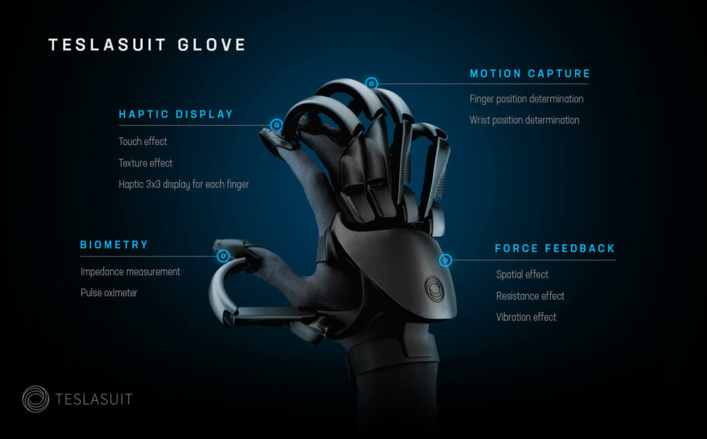 The TESLASUIT GLOVE can be worn with the suit or on its own. It is the world's first TESLASUIT-compatible VR glove, including haptics, motion capture, biometry, and force feedback. The glove has a variety of innovative uses, including enterprise XR training, rehabilitation, and much more.