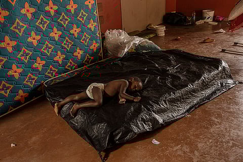 A child sleeps at the Lycée des Lumières where he found refuge in Mamoudzou, Mayotte,