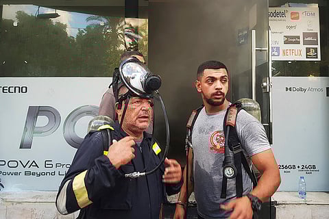 Firefighters stand outside a damaged mobile shop after what is believed to be the result of a walkie-talkies exploding inside it, in the southern port city of Sidon, Lebanon.