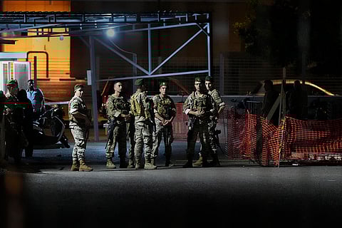 Lebanese soldiers stand guard as their comrades prepare to detonate a walkie-talkie that was found at the parking of the American University Hospital, in Beirut, Lebanon.