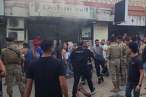 Lebanese soldiers and firefighters gather outside a mobile shop after what is believed to be the result of a walkie-talkie exploding inside it, in the southern port city of Sidon, Lebanon.