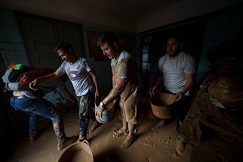 People clean a house of mud in an area affected by floods in Sedavi, Spain.