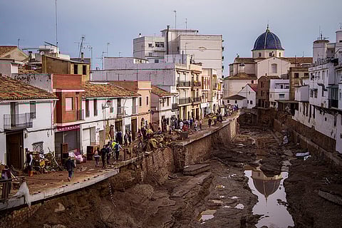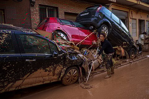 A woman cleans the street of mud in an area affected by floods in Sedavi, Spain.