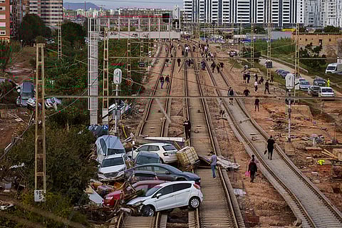 People walk along the train tracks heading toward Valencia in an area affected by floods in Sedavi, Spain.