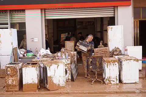 People clean mud from a shop affected by floods in Chiva, Spain.