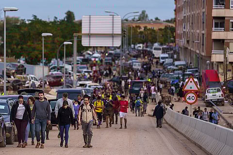 People walk toward Valencia after helping with cleaning efforts in an area affected by floods in Sedavi, Spain.