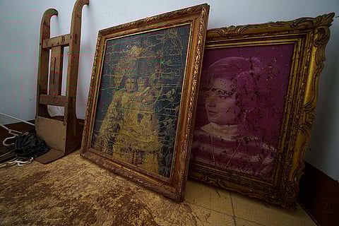 A religious image and a family photograph are pictured covered in mud inside of a house in an area affected by floods in Sedavi, Spain.
