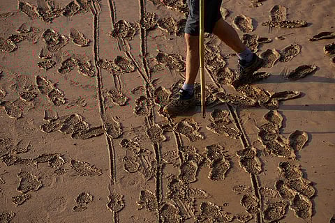 A man walks on a mud-covered road after flooding in Valencia, Spain.
