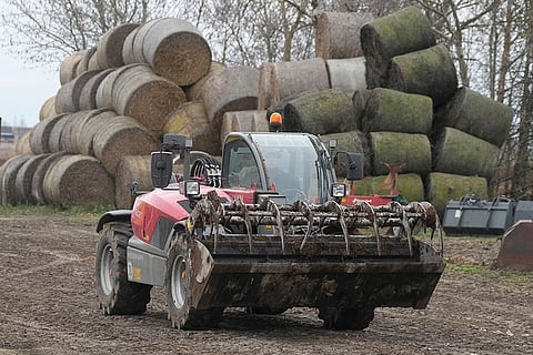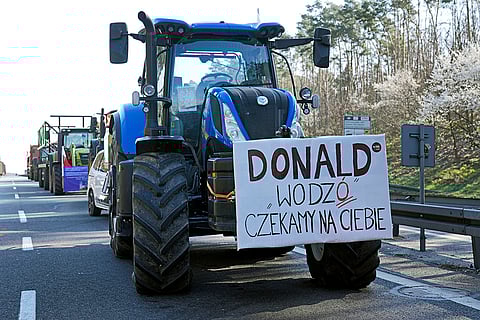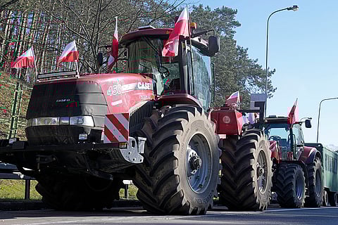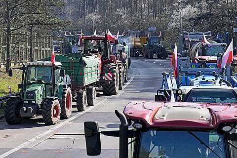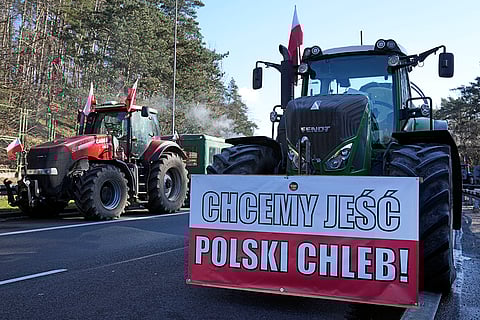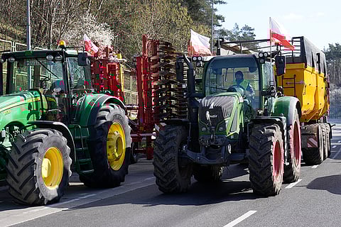 Tractors line up to block a road near the German border in Swiecko at Slubice, Poland. Polish farmers are blocking the border with Germany at Frankfurt an der Oder as they continue their protests against European Union climate policies and food imports from Ukraine that they say threaten their livelihoods.