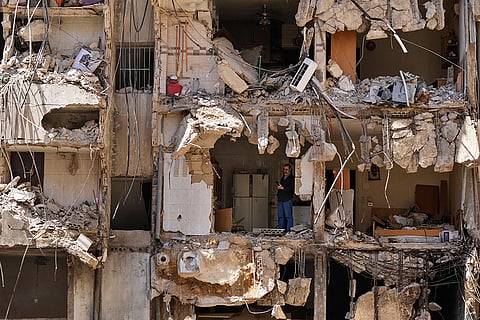 A man watches rescuers sift through the rubble as they search for people still missing at the site of Friday's Israeli strike in Beirut's southern suburbs.