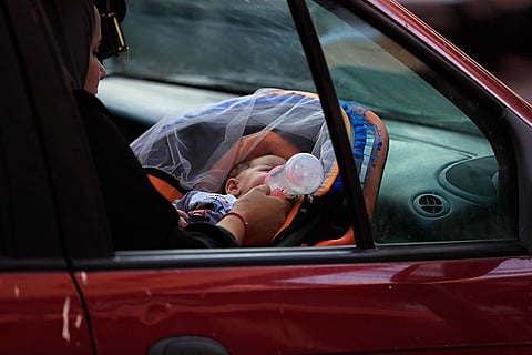 A woman feeds her newborn in a car in Sidon, Lebanon, as she flees the southern villages amid ongoing Israeli airstrikes.