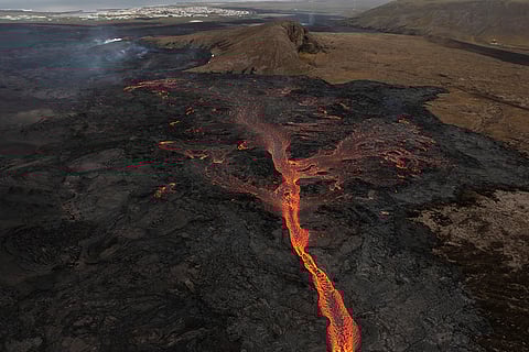 Lava flows from an active crater of a volcano in Grindavik, Iceland. Lava continued to spurt from a volcano in southwestern Iceland on Thursday but the activity had calmed significantly from when it erupted a day earlier.