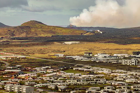 The houses are seen, with the main eruptive crater in the background in Grindavik, Iceland.