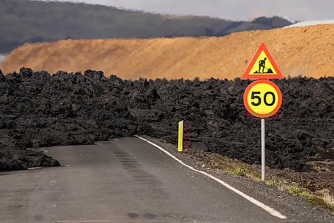 A road is covered by lava flow from a volcano in Grindavik, Iceland.