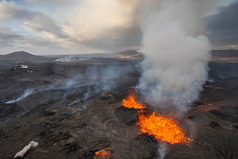 The main active craters of a volcano are seen in Grindavik, Iceland.