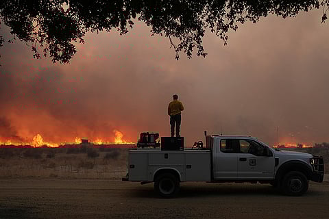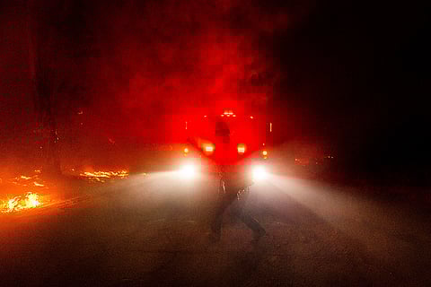 A firefighters monitors flames caused by the Hughes Fire is seen in Castaic, California.