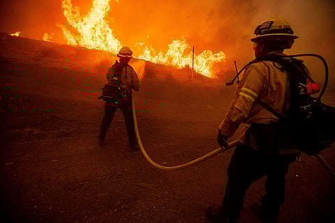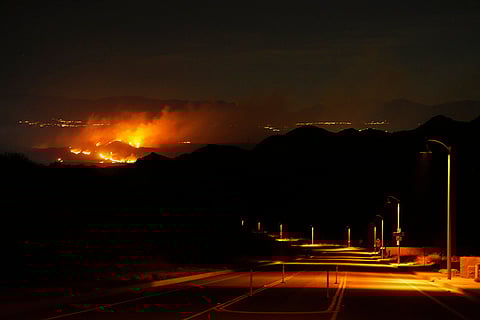 Firefighters monitor flames by the Hughes Fire in Castaic, California.