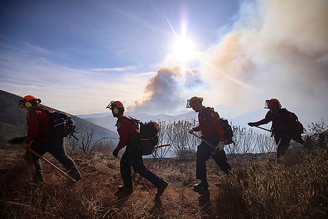 Firefighters walk along a mountainside to battle the spread of the Hughes Fire in Castaic, California.