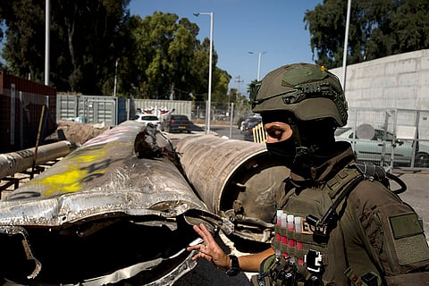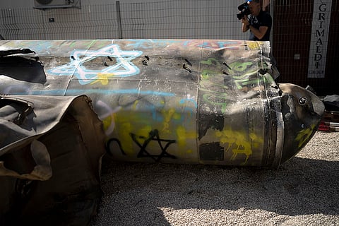 Iranian ballistic missile components that were fired at Israel are displayed during a government-organized media tour on a base in southern Israel.