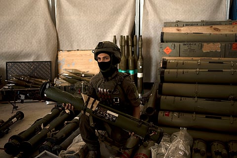 Members of the Israel Defense Forces Spokesperson's Unit stand beside weapons used by Hezbollah seized during combat operations in Lebanon displayed during a government-organized media tour on a base in southern Israel.
