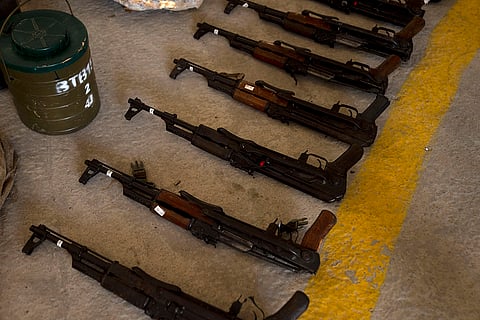 Weapons used by Hezbollah seized during combat operations in Lebanon are displayed during a government-organized media tour on a base in southern Israel.