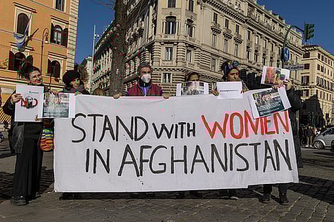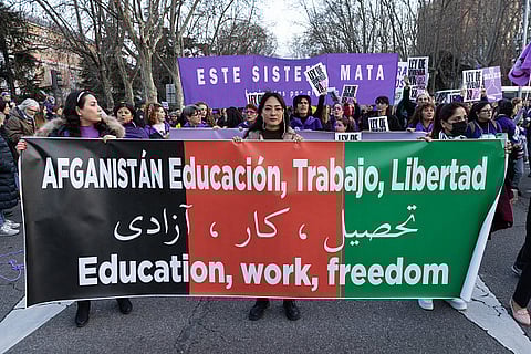 Demonstrators in support of women of Afghanistan hold a banner during the march of the International Women's Day on March 08, 2023 in Madrid, Spain.