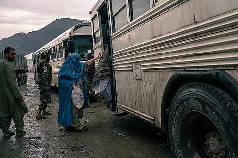 A woman steps onto a bus leading her to a camp set up for returnees who have been deported or coerced into leaving Pakistan, at the Torkham border crossing in Nangarhar province, Eastern Afghanistan, on November 9, 2023. In 2021, over 600,000 Afghanis fled to Pakistan after the Taliban takeover and in November 2023, Pakistan coerced many of these Afghan refugees to return, saying the deportation drive was long overdue.