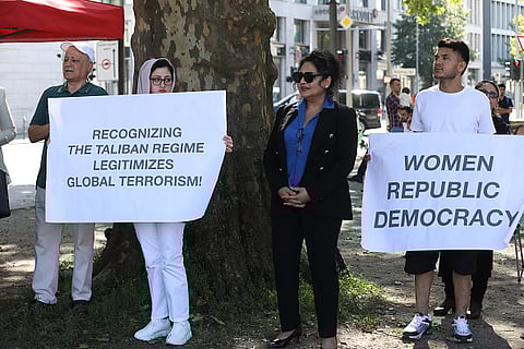 Protesters demonstrate outside the Foreign Ministry against the Taliban two years since the Taliban takeover in Afghanistan on August 15, 2023 in Berlin, Germany.