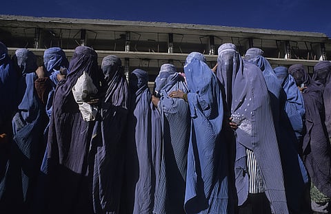 Women, many of them widows, queue to receive food aid from Care International, in Kabul. Afghanistan.