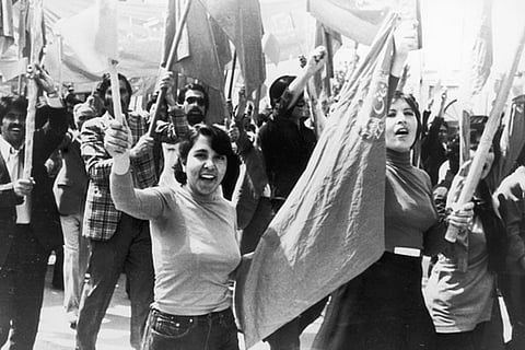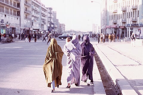 Three women in colorful burkas with covered faces walk down a street, their crisp modern slacks and Western style high heel shoes peeking out from underneath, in Kabul, Afghanistan, in November 1973.