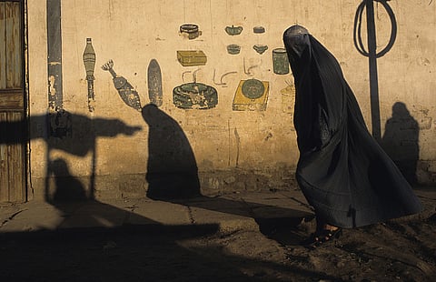 Woman in a burqa walking past a wall with different sorts of landmines and other weapons drawn on it in Kabul.