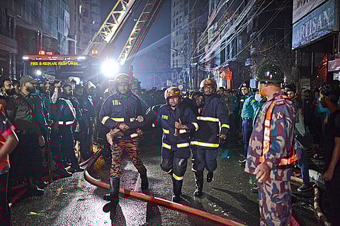 Firefighters work to contain a fire that broke out at a commercial complex in Dhaka, Bangladesh.