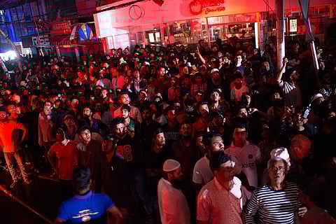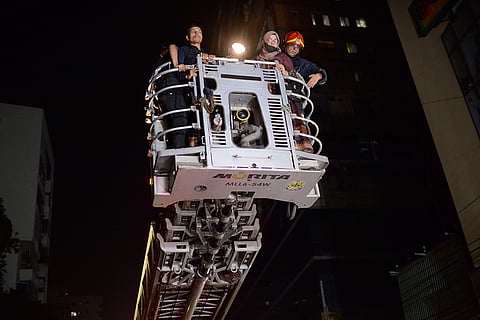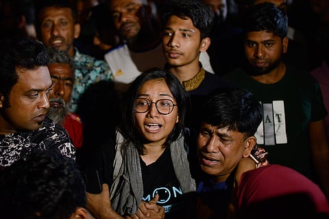 Family members of a person stuck at a commercial complex reacts as firefighters try to rescue them from a fire in Dhaka, Bangladesh. Bangladesh's health minister says a fire in a six-story commercial complex in the nation's capital, Dhaka, has killed several people and injured dozens of others.