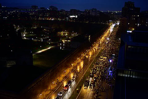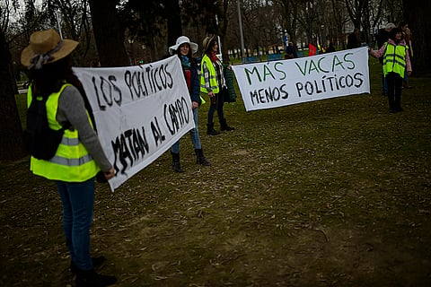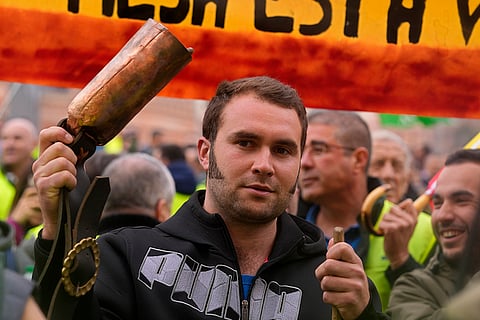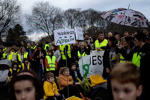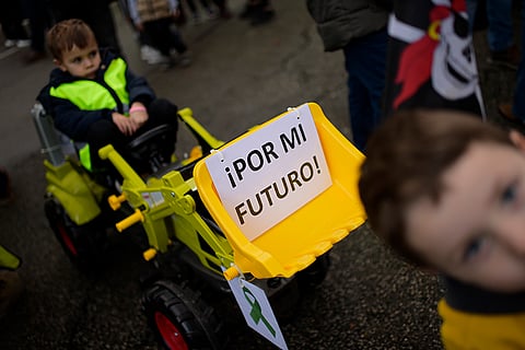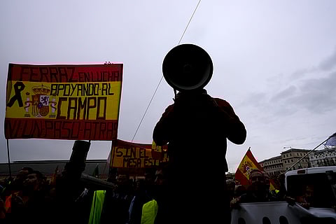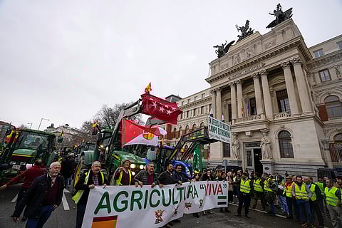 Police guide part of a convoy of tractors that arrived in Madrid, Spain. The farmers parked their tractors in front of the Agriculture Ministry as part of widespread ongoing protests over European Union farming policies and to demand measures to combat production cost hikes, reduced profits, and unfair competition from non-EU countries.