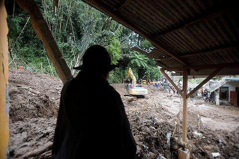 A villager looks on as rescuers use a heavy machinery to search for victims of a landslide that killed a number of people and left some others missing in Karo, North Sumatra, Indonesia.