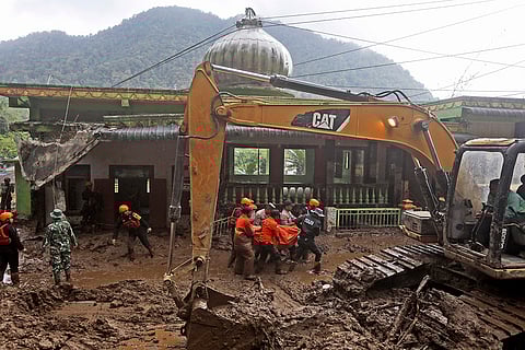 Rescuers carry the body of a victim of the landslide in Karo, North Sumatra, Indonesia.