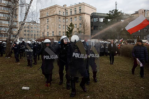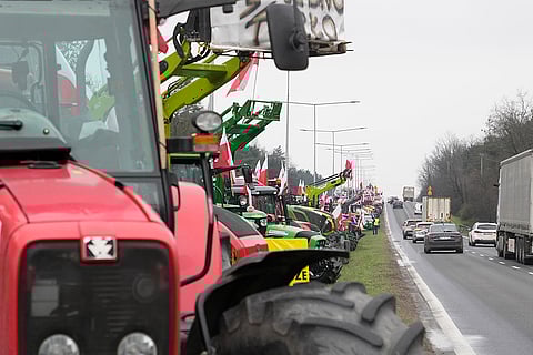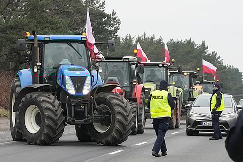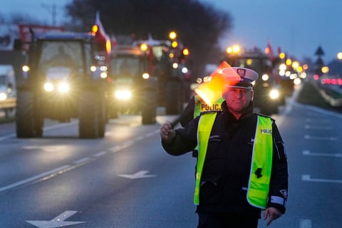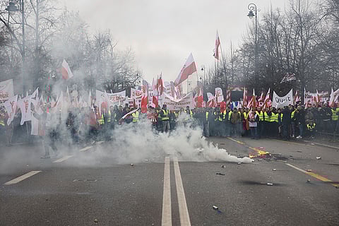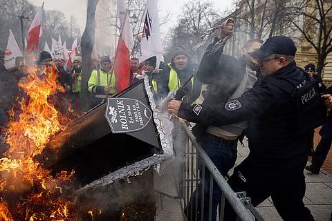 Police officers detain a man during farmers protest in Warsaw, Poland. The protest ratchets up pressure on the government as they demand the Poland-Ukraine border closed to food imports and demand changes to European Union climate and agricultural policies.