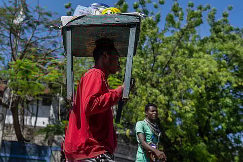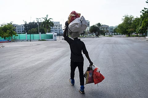 A person hauling bags walks past the National Palace in Port-au-Prince, Haiti.