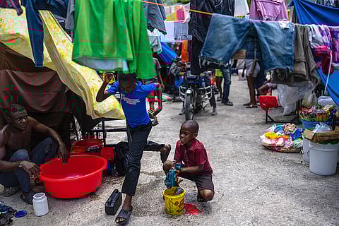 A youth washes clothes at a public school that serves as a shelter for people displaced from their homes due to clashes between armed gangs in Port-au-Prince, Haiti.