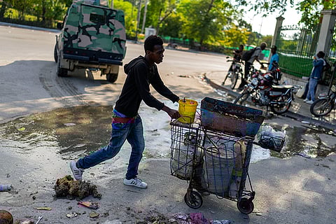 A street vendor pushes his cart past the National Palace as an armored police car patrols the area, in Port-au-Prince, Haiti.